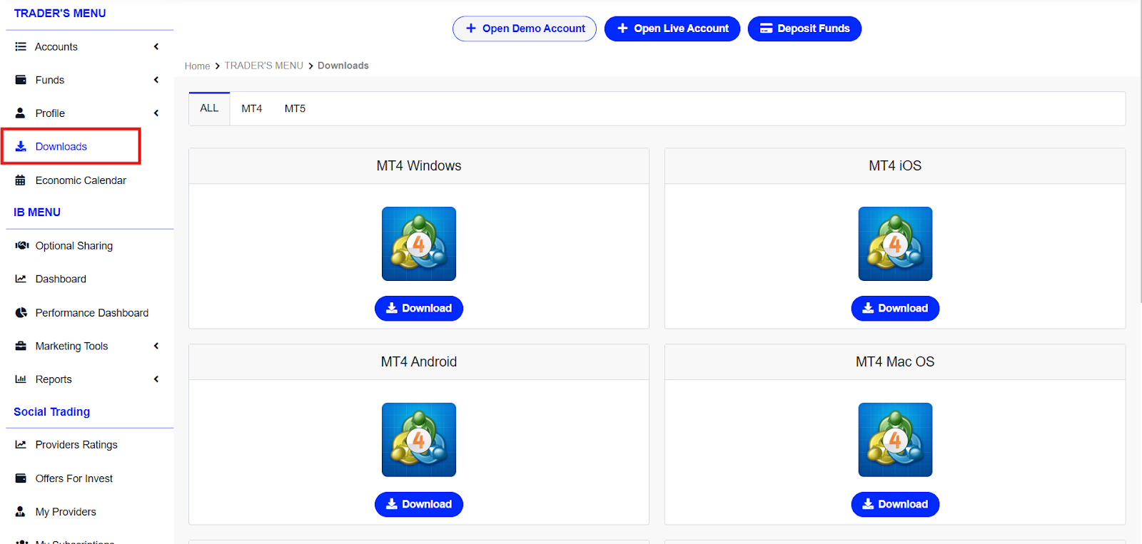 Go to the "Downloads" section and choose MetaTrader 4 or MetaTrader 5 for Windows or macOS, depending on your operating system.