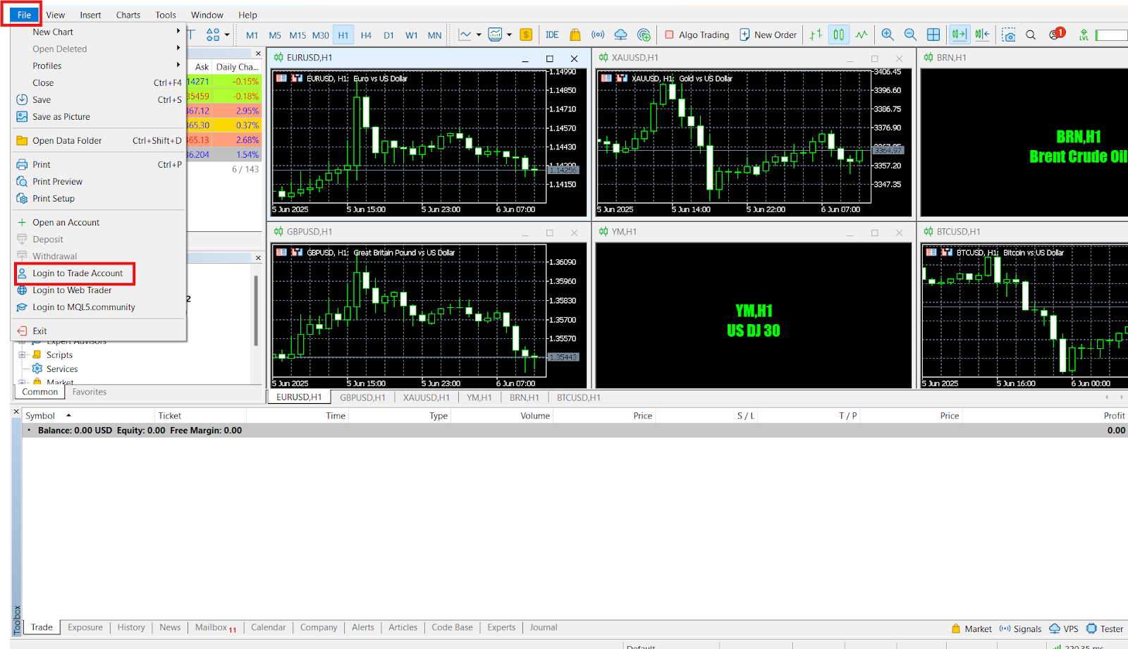 In the platform's top menu, click "File" → "Login to Trade Account".