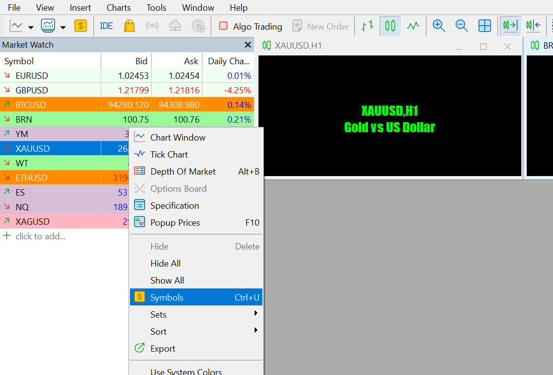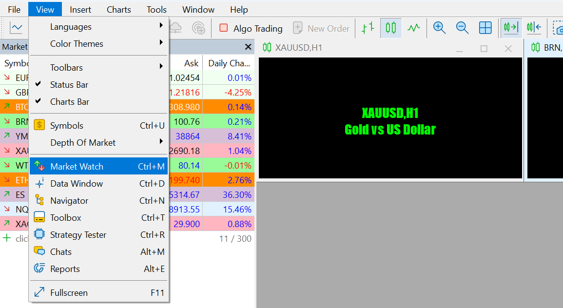 1. Open the "Market Watch" window: Click View > Market Watch, or use the shortcut Ctrl + M.