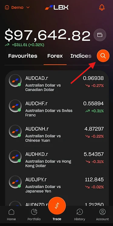 The Forex and Indices tabs contain all available trading instruments. You can browse the list or find a specific instrument by tapping the search icon.