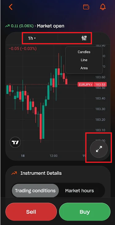 The Instrument view features a chart that can be customized by time frame and display method. You can also expand the chart to access all available technical settings and tools.