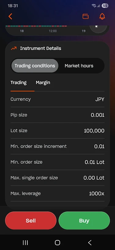 Below the chart, you can find the Instrument Details section, which shows the trading conditions and market hours for the selected instrument.
