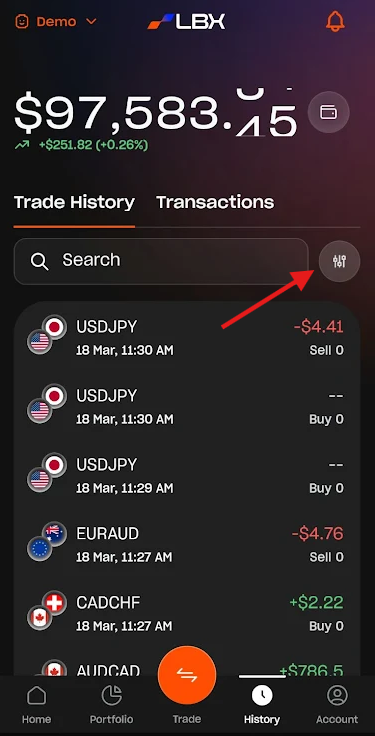 The Trade History allows you to track all positions for the selected account. You can also filter positions by trade direction (Buy/Sell), profitability (winning or losing trades), and asset class by tapping the filter icon.