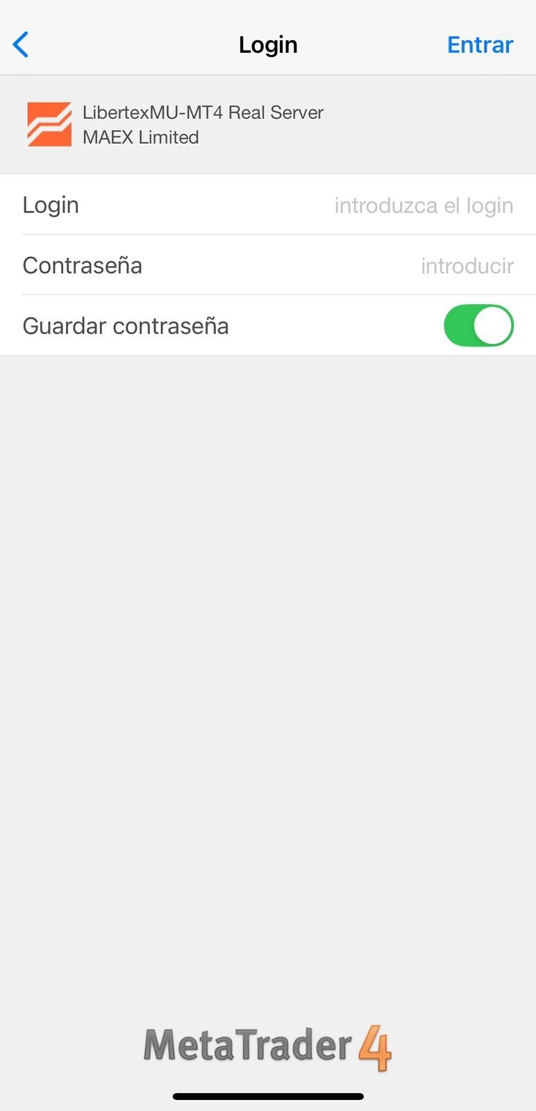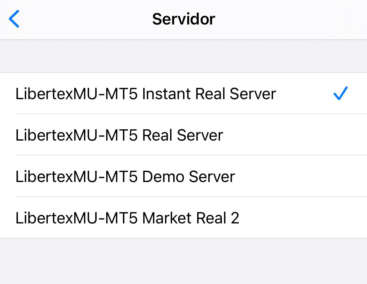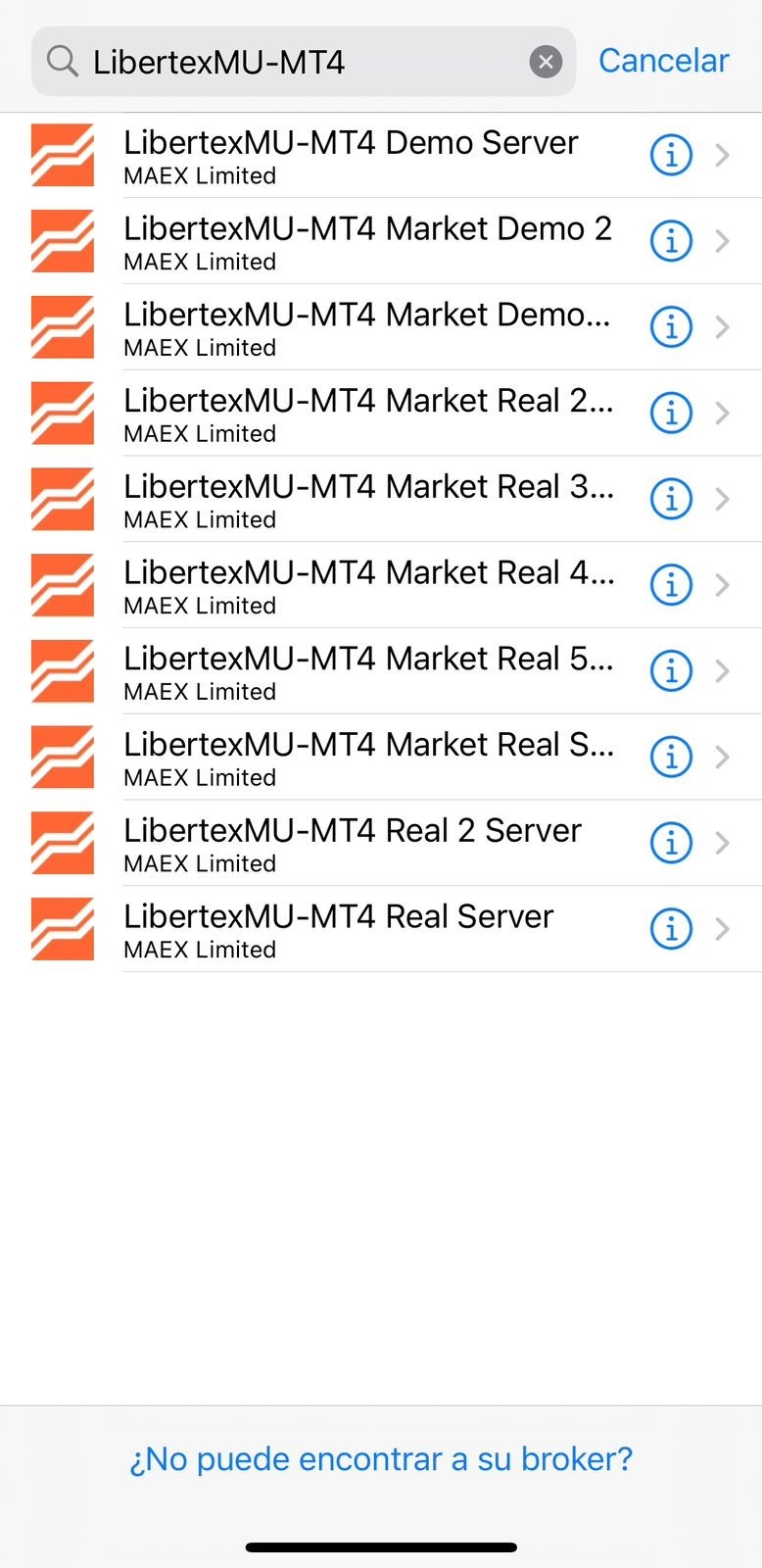 Ejemplo: LibertexMU-MT4 Market Real 1 o LibertexMU-MT4 Market Demo 2 (Asegúrate de usar el nombre exacto del servidor indicado en tu cuenta LBX)