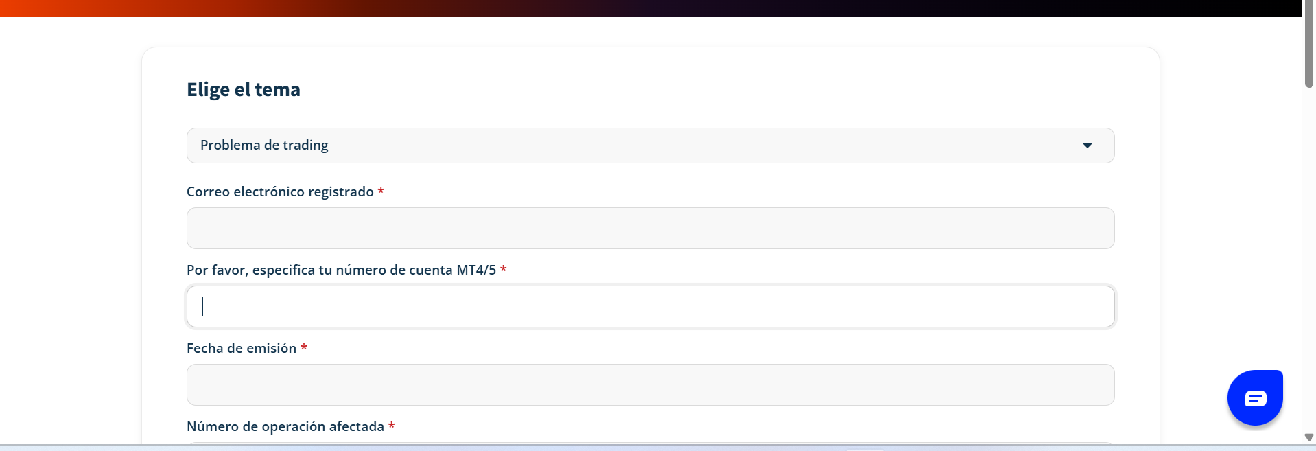 Si crees que una transacción en tu cuenta de trading en vivo fue ejecutada o procesada incorrectamente, puedes presentar una reclamación de trading para que sea revisada.