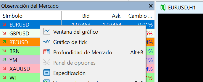 2. Seleccione el instrumento de negociación: En la ventana "Observación del mercado", busque el instrumento al que desea agregar un gráfico. Si no ve la ventana, presione Ctrl + M para abrirla.