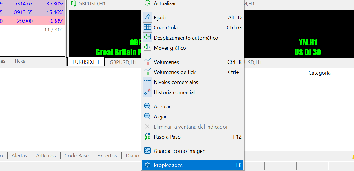 4. Ajustar la configuración del gráfico (opcional): Una vez abierto el gráfico, puede ajustar el color, el estilo y otros parámetros haciendo clic derecho sobre el gráfico y seleccionando "Propiedades".