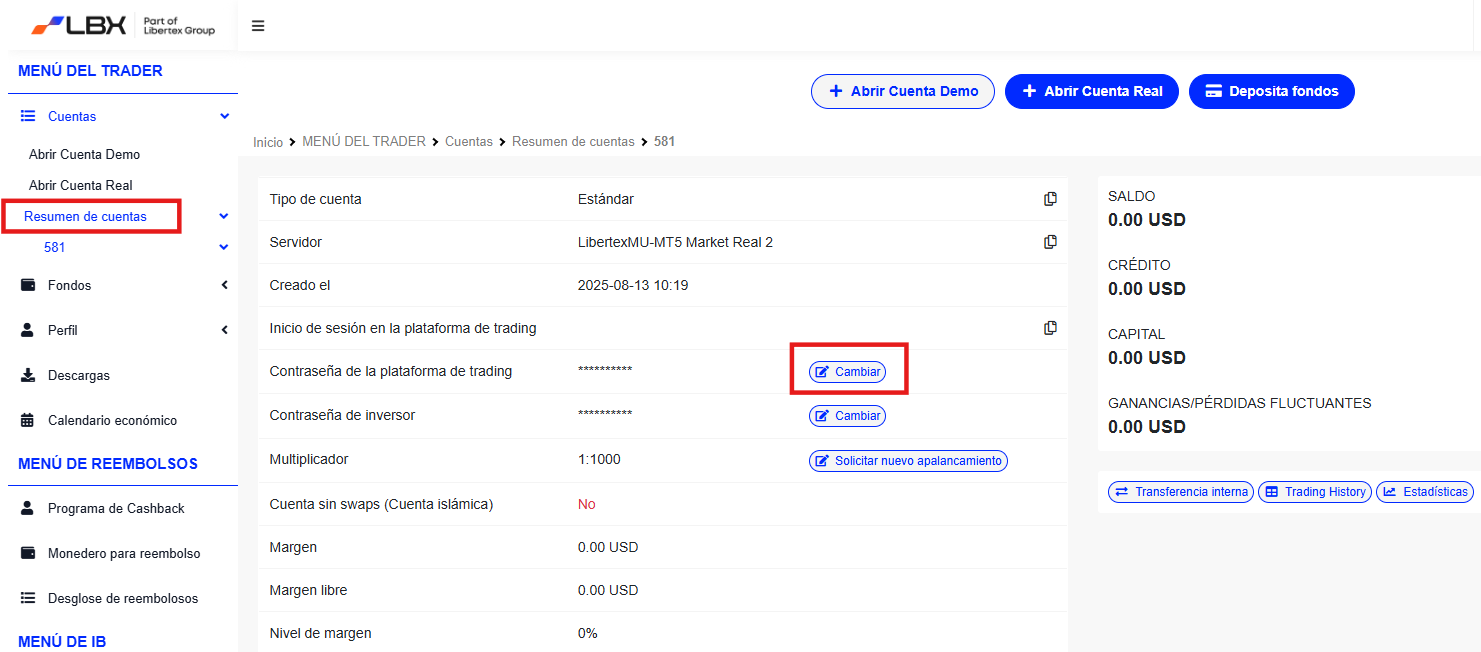 Para cambiar o restablecer la contraseña de su cuenta de trading, siga estos pasos:
