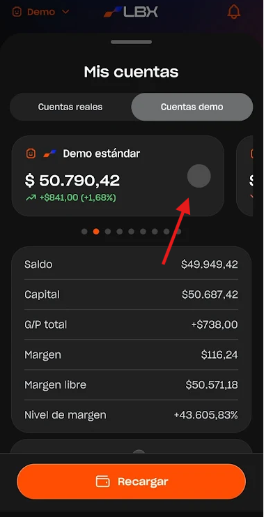 4. Recargar cuentas de demo: Elija la cuenta de demo necesaria y toque el botón "Recargar".