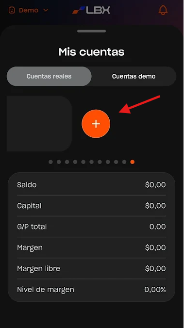 2. Crear una nueva cuenta de trading: Deslice la lista de cuentas hacia la derecha y toque el botón "+".