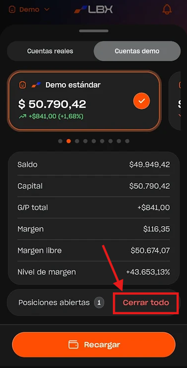 Esta función le permite cambiar entre cuentas reales y de demo, así como crear nuevas cuentas de trading. Desde aquí, también puede cerrar todas las posiciones en la cuenta seleccionada o recargar el saldo de sus cuentas de demo.