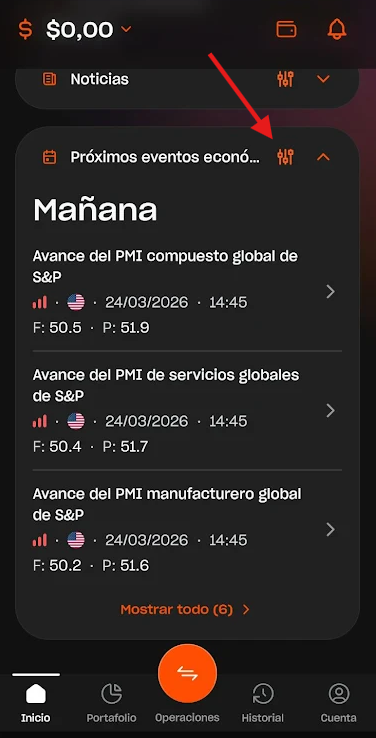 La sección de Próximos eventos económicos destaca eventos globales clave que pueden impactar sus instrumentos y posiciones. Mantenerse informado le permite gestionar sus operaciones de manera efectiva y ajustar su estrategia en consecuencia. También puede filtrar los eventos por rango de fechas, región e importancia tocando el icono de filtro.