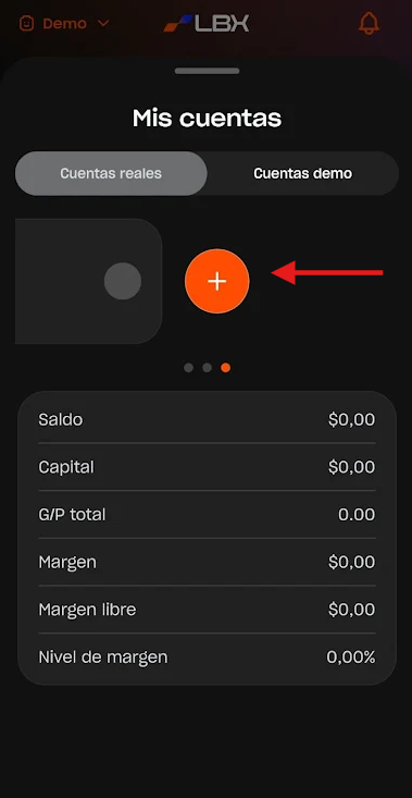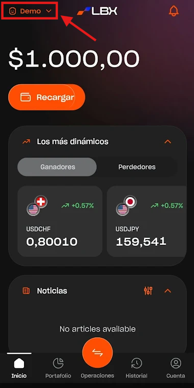 1. Toque el botón "Demo" o "Real" en la esquina superior izquierda de la pantalla para ver sus cuentas.