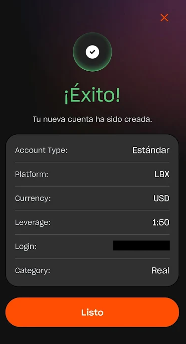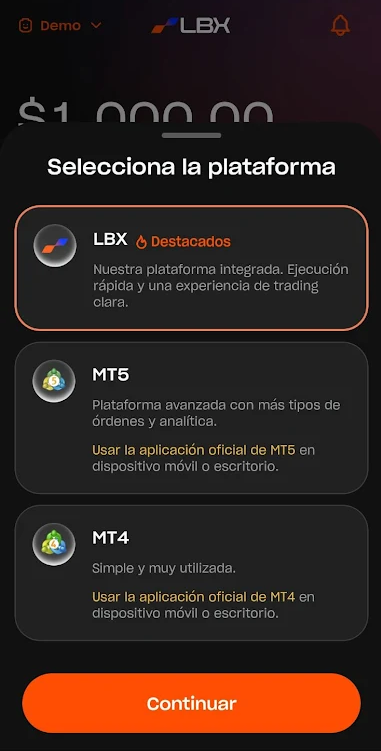 3. Seleccione su plataforma preferida: ofrecemos cuentas nativas de LBX para operar directamente dentro de la aplicación, así como cuentas de MetaTrader 4 y 5.