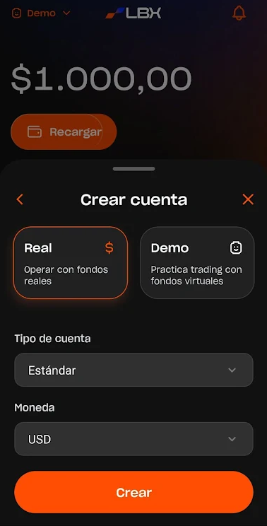 4. Seleccione el tipo de cuenta y la moneda, luego toque en "Crear".