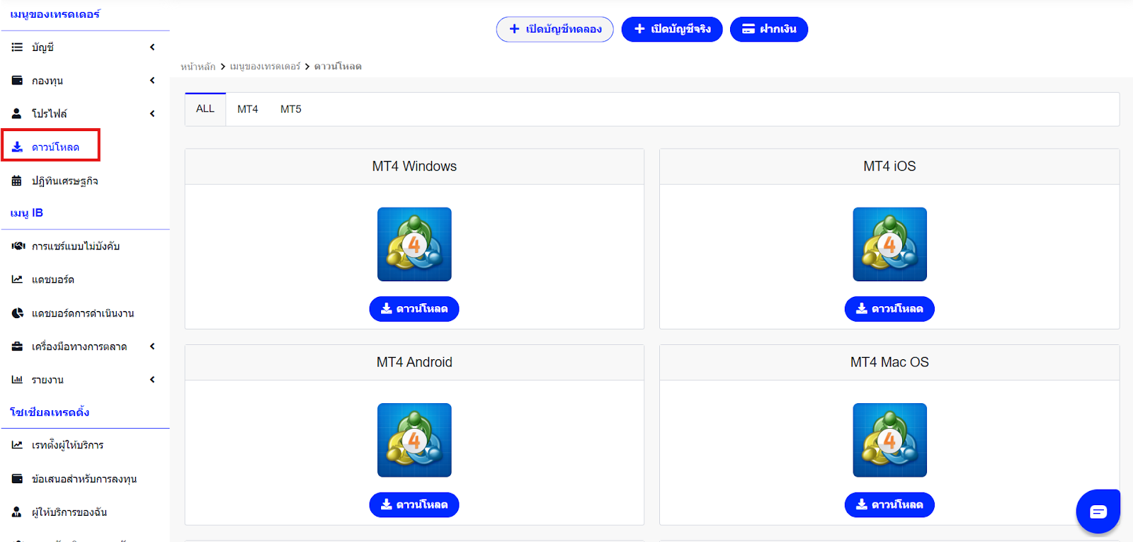 ไปที่เมนู "ดาวน์โหลด" แล้วเลือก MetaTrader 4 หรือ MetaTrader 5 สำหรับ Windows หรือ macOS ตามระบบปฏิบัติการของคุณ