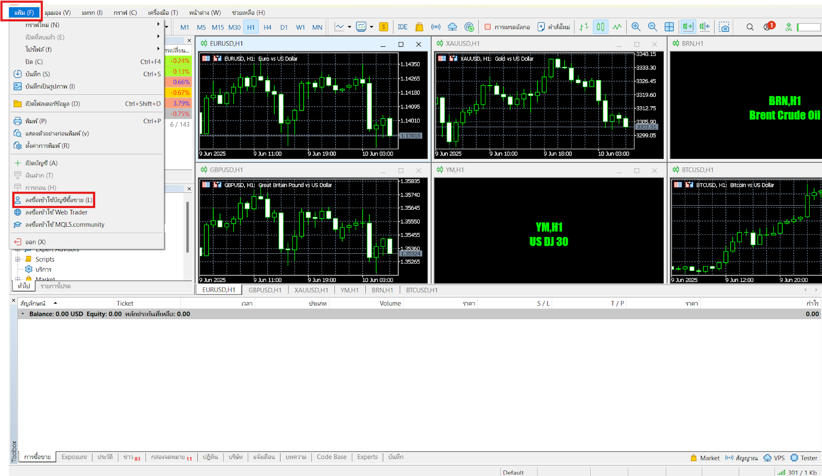 จากแถบเมนูด้านบนของแพลตฟอร์ม ให้คลิกที่ "แฟ้ม" → "ลงชื่อเข้าใช้บัญชีซื้อขาย"