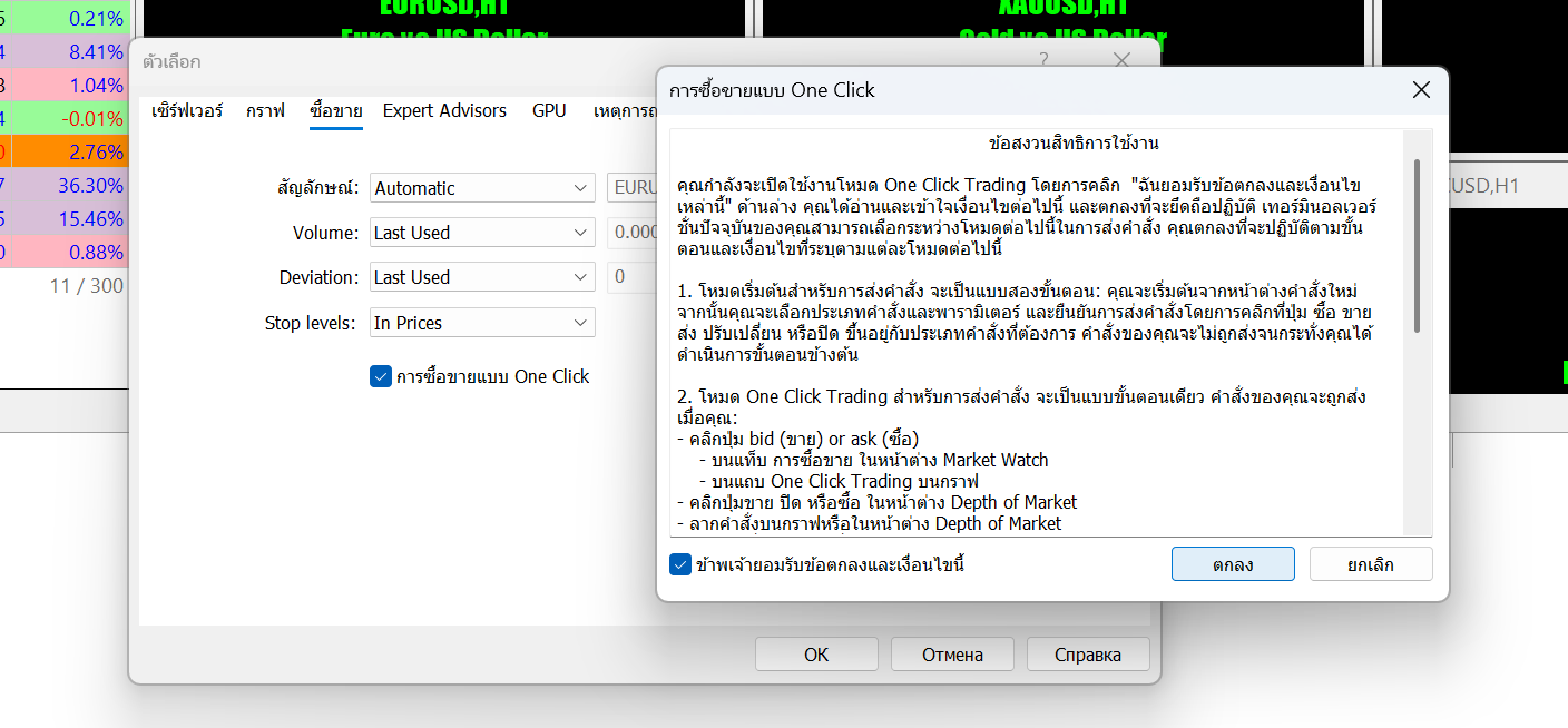 โปรดทราบ: ในการใช้ฟีเจอร์นี้ คุณต้องยอมรับข้อกำหนดและเงื่อนไขพิเศษ ตัวเลือก One Click Trading จะดำเนินการซื้อขายด้วยการคลิกเพียงครั้งเดียวโดยไม่ต้องการการยืนยันเพิ่มเติมจากนักเทรด (หน้าต่างโต้ตอบการซื้อขายจะไม่ปรากฏขึ้น)