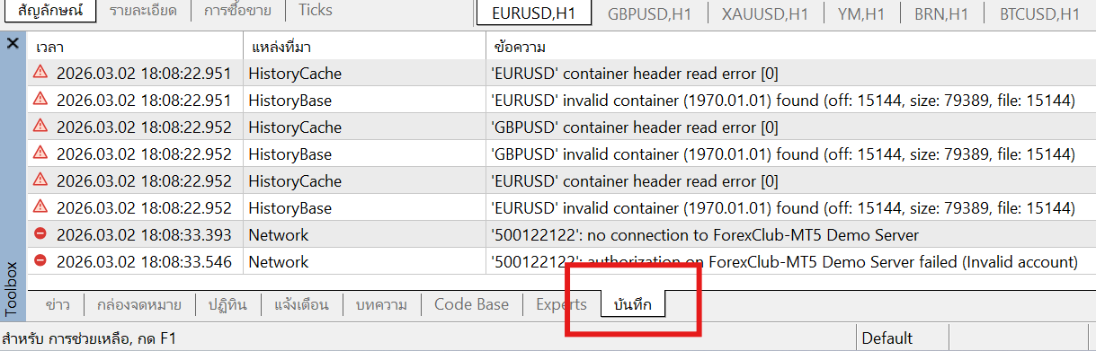 2. ในหน้าต่าง Toolbox ที่ด้านล่างของหน้าจอ ให้คลิกที่แถบ "บันทึก" (Journal) เพื่อดูบันทึกกิจกรรมทั้งหมดของแพลตฟอร์ม รวมถึงการเข้าสู่ระบบและการส่งคำสั่งซื้อขาย