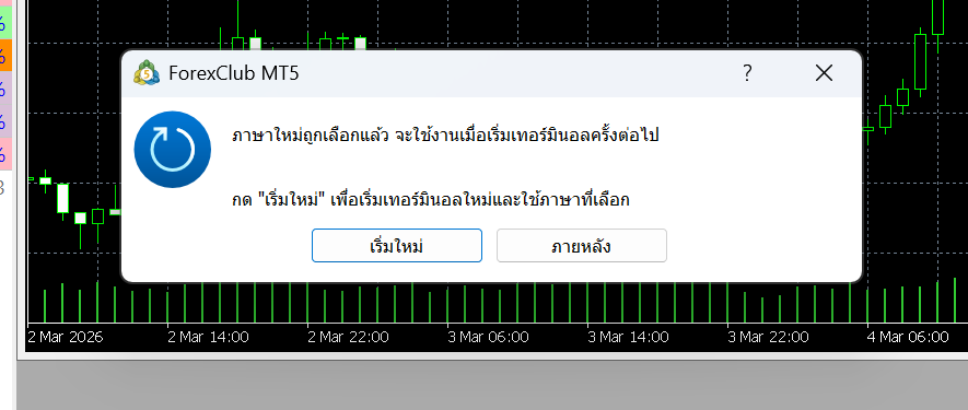 3. รีสตาร์ทแพลตฟอร์ม: จะมีหน้าต่างป๊อปอัปปรากฏขึ้นเพื่อขอให้เริ่มโปรแกรมใหม่ ให้คลิกที่ปุ่ม "เริ่มใหม่" (Restart) เพื่อเริ่มการใช้งานในภาษาใหม่