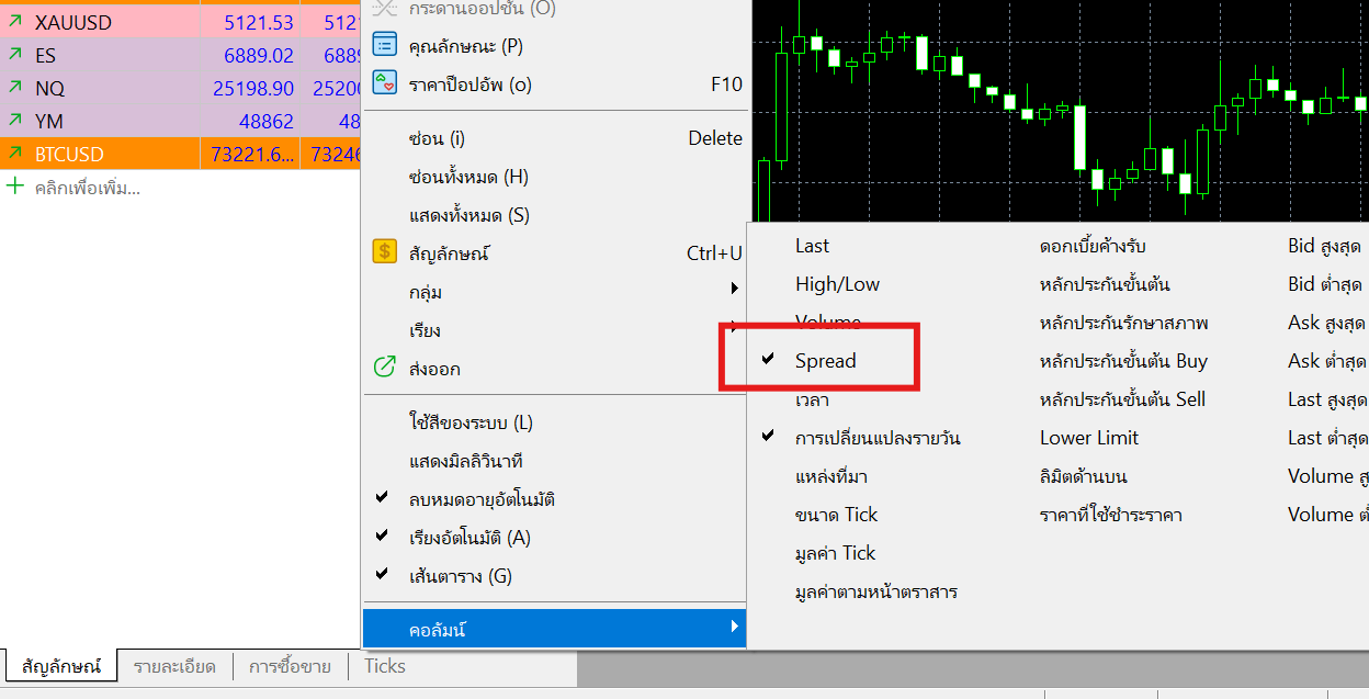 3. จากเมนูที่ปรากฏขึ้น ให้คลิกเลือก "Spread" หรือเลือก "คอลัมน์" (ใน MetaTrader 5)
