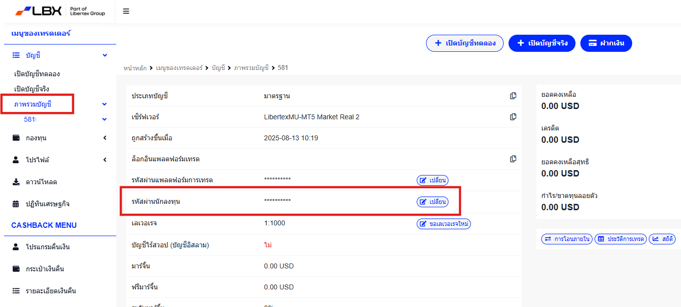 3. คลิกที่เลขบัญชีที่ต้องการ และหาแถวที่เขียนว่า "รหัสผ่านนักลงทุน" จากนั้นคลิก "เปลี่ยน" เพื่อตั้งค่ารหัสผ่านนักลงทุนของคุณ