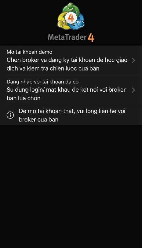 Hãy chắc chắn bạn đang dùng đúng ứng dụng MT4 hoặc MT5 phù hợp với loại tài khoản của mình.